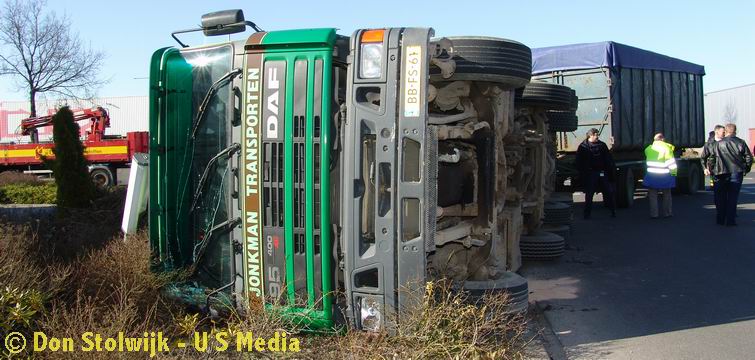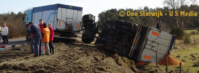 De trucker probeerde -tevergeefs- door heftig remmen een aanrijding te voorkomen, maar de combinatie belandde in de rechter berm.