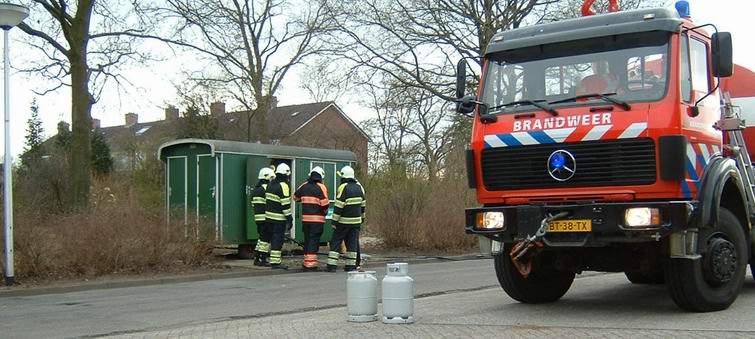 Twee gasflessen konden tijdig uit het houten onderkomen geborgen worden.