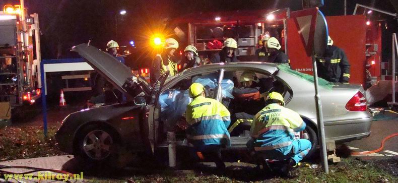 | De Clio-bestuurder kon zelf uit zijn voertuig komen en werd per ambulance voor controle naar het Bethesda-ziekenhuis overgebracht. De man in de Mercedes was er slechter aan toe en moest vanwege mogelijk nek- of rugletsel door de Hoogeveense brandweer "uitgeknipt" worden. De "Powermoon" lamp zorgde ervoor, dat de directe omgeving van het voorval in helder licht baadde. Nadat het dak van de Mercedes weggeknipt was met behulp van hydraulisch gereedschap, werd het slachtoffer op een wervelplank vastgemaakt en vervolgens per brancard naar de ambulance overgebracht. |