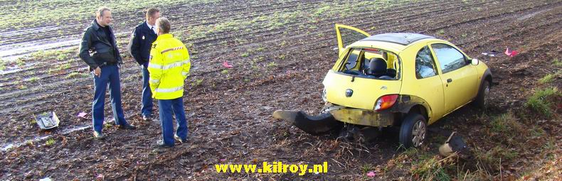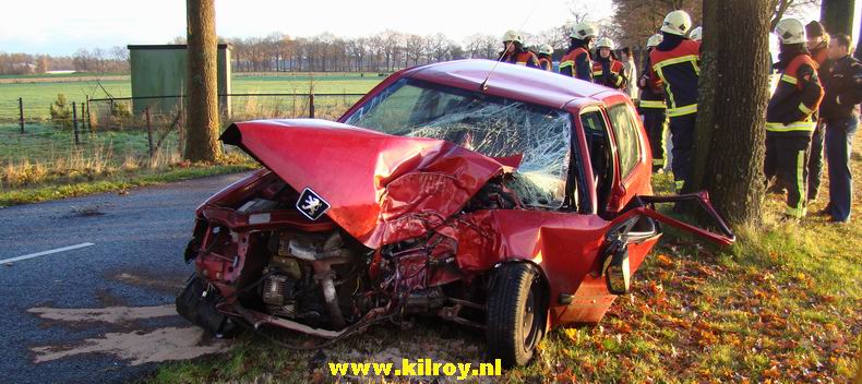 | Ook een 28 jaar oude automobiliste uit Nieuw Amsterdam werd onaangenaam verrast door een glibberig wegdek. Haar auto maakte knalhard kennis met een boom aan de Zweelooërstraat en vloog vervolgens dwars de weg over. De rode Peugeot 106 was daarna rijp voor de sloop. De vrouw liep -naar het zich liet aanzien- onder meer een flinke hersenschudding op. Berger de Jong ontfermde zich over beide voertuigen. |