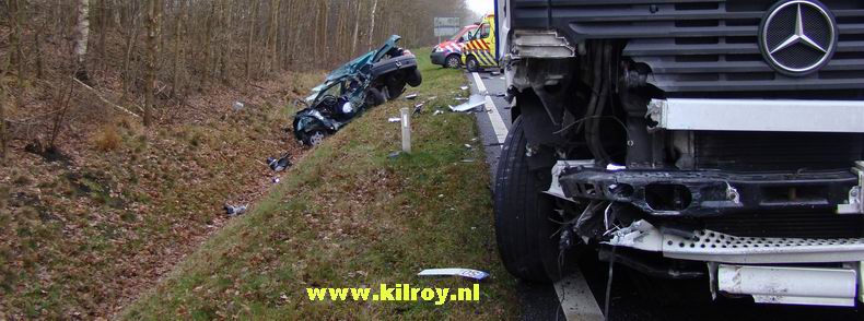 | Politie, ambulances en de brandweer van Gramsbergen en Hardenberg kwamen rond 18:15 uur in aktie na een melding van een verkeers-ongeval op de N34 bij hectometerpaal 36.8, ter hoogte van Anevelde. Bij aankomst trof men op de weg een aan de voorzijde zwaar beschadigde Opel Zafira aan, die frontaal op een hoogwerker was gebotst. De bestuurder van deze auto, een 51-jarige man uit Coevorden, reed volgens de sporen op de verkeerde weghelft. Hij bleek de aanrijding niet te hebben overleefd. De eveneens ernstig beschadigde truck -eigendom van een constructie- en schilderbedrijf in Nieuwegein- was aan de noordzijde van de autoweg in een weiland tot stilstand gekomen, waarbij de cabine door de klap ontgrendelde en voorover viel. De 34-jarige trucker uit Hardenberg liep nekletsel en niet-ernstige snijwonden aan het hoofd op; zijn circa vijf jaar oude dochtertje hield een hersenschudding en een buil op haar hoofd aan de klap over. Ze zijn beiden per ambulance voor behandeling naar een ziekenhuis overgebracht. |