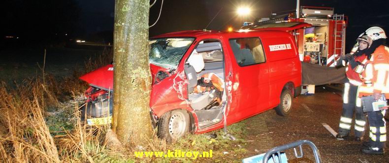 | Op de Norgerweg in Donderen moest de brandweer zaterdagavond een vrouw uit een personenbusje bevrijden, nadat dat in dichte mist frontaal tegen een boom reed. Het busje, bestuurd door een 35-jarige man uit het Poolse Sternalice, was ter hoogte van de Eenkhoornstraat van de weg geraakt en stond met de neus van z'n busje tegen een boom "geparkeerd". |