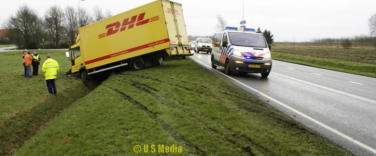 Volop remmen voorkwam niet, dat de truck met de neus in de linker bermsloot belandde.