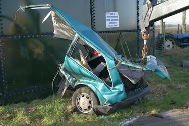 De andere auto -een groene VW Polo- die over de Oosterslagen richting Schuinesloot reed, was door de klap finaal in tweeën gebroken.