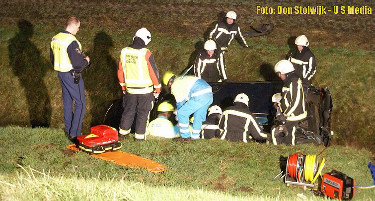 Ambulance- en politiemensen troffen nabij de kruising twee zwaar beschadigde auto's aan, waarvan er één achterstevoren boven een sloot stond.