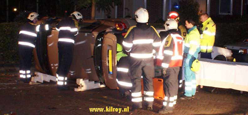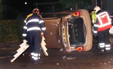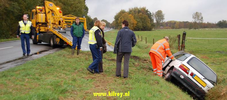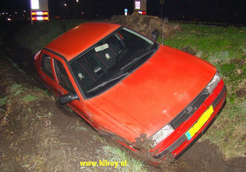 | In het begin van de avond beleefden de twee inzittenden van een personenauto een flinke schrik. Ze reden over de Weverijweg naar de rotonde in de Coevorderweg, tot ze tot hun schrik plots ontdekten, dat er vóór hen een rij auto's stilstond. Abrupt remmen had tot gevolg, dat de auto op het natte wegdek onbestuurbaar werd, in de flauwe bocht rechtdoor gleed en op z'n kant in de rechter bermsloot belandde. |