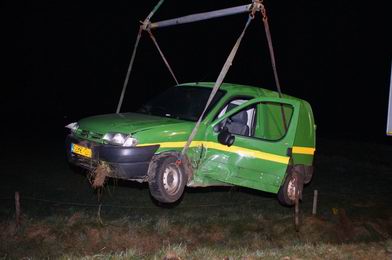 | De bestuurder en z'n vriendin -beide uit Slagharen- konden zelf uit de auto klauteren. De bestuurder bleef nagenoeg ongedeerd; de passagiere bleek wat schouder- en ribkneuzingen opgelopen te hebben; waarschijnlijk door haar veiligheidsgordel, die haar echter voor erger behoedde. Berger Autax takelde de auto uit de circa twee meter diepe sloot en zorgde ervoor, dat de auto bij een garagebedrijf in Lutten werd afgeleverd. Het verkeer op de rondweg ondervond geen noemenswaardig oponthoud van het bergingswerk, mede dank zij verkeersregeling door de politie. |