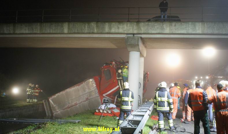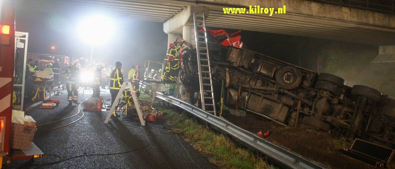 | Rond kwart voor vier vannacht werden diverse hulpverleners naar de A28 bij Rouveen ontboden vanwege een zeer ernstig ongeval. Het bleek, dat er op het traject Zwolle - Meppel een dubbellaags veewegen met zo'n tachtig nuchtere kalveren over de vangrail tegen een pijler van het viaduct van de Sluitersweg (even ten noorden van de Lichtmis) was gereden en met de achterzijde van de laadruimte deels in een sloot was beland. De bestuurder kwam daarbij bekneld te zitten in het wrak en moest door de brandweer, ambulance- en MMT-personeel bevrijd worden, hetgeen circa anderhalf uur in beslag nam. De trucker, die goed aanspreekbaar was, klaagde over buikpijn en is met spoed naar het ziekenhuis overgebracht, waar hij geopereerd is. Het zicht op het ongeval werd voor het verkeer tussen Meppel en Zwolle met een calamiteitenscherm ontnomen. De snelweg van Zwolle richting Meppel sindsdien afgesloten. |