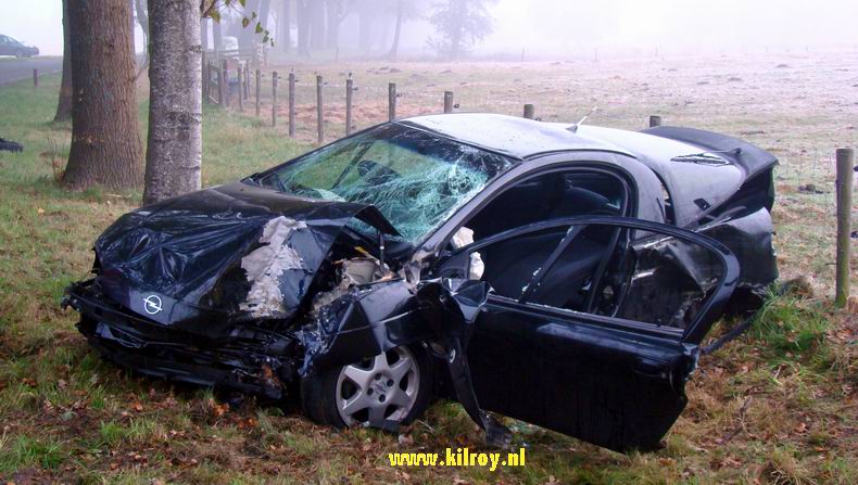 De auto kwam na een bocht vlak voor de bebouwde kom kort met de rechter wielen in de berm, waarna het klassieke scenario "ruk aan het stuur, dwars de weg over tegen een boom" volgde. De Tigra sloeg tegen een berk en vervolgens frontaal tegen een tweede boom. De auto verloor hierbij een wiel en de diverse andere onderdelen, die over een flinke afstand verspreid werden, tot in de aangrenzende akker. |