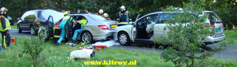 | Exact half zes vanmiddag verscheen er een melding op de brandweerpagers: "VKO Auto-auto N862 Klazienaveen" Het bleek te gaan om een kettingbotsing tusssen drie personenauto, waaronder een taxi, waarbij drie inzittenden gewond waren geraakt. De taxichauffeur, die richting Klazienaveen reed, had te laat in de gaten, dat het verkeer voor hem plotseling afremde en botste op een Mercedes C220 CDI, die tegen een derde auto doorschoot. In het middelste voertuig liep de bestuurder nekpijn op en moest door de brandweer voorzichtig uit de auto gehaald worden. De man werd per ambulance afgevoerd. In de taxi bleef de bestuurder nagenoeg ongedeerd, maar de passagier op de voorstoel ging per ambulance naar het Scheperziekenhuis. De passagier op de achterbank raakte licht gewond, maar hoefde na onderzoek niet mee met de ziekenauto. De bestuurder van de voorste auto kwam met de schrik vrij. |