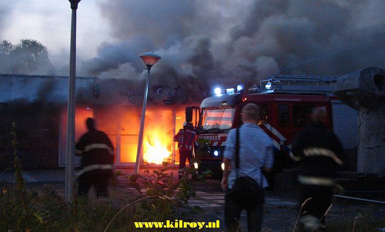 | In het gedeelte waar de brand woedde, zijn onder meer ook het CBR en een muziekverening gevestigd. Het blussen was nog best een lastige klus, want het vuur zag kans zich boven het plafond te verspreiden. Om die reden werd er door de bevelvoerder ook opgeschaald naar status 'grote brand', wat de komst van twee extra tankautospuiten betekende. Na ongeveer een uur had de brandweer het vuur onder controle. Naar verluidt is het vuur ontstaan in een asbak, die pal naast de ingang stond. Er zijn geen gewonden gevallen. Hoe groot de schade is, is op dit moment nog niet bekend. Zeker is, dat nagenoeg het gehele gebouw flinke rook- en waterschade heeft overgehouden aan deze brand. |
