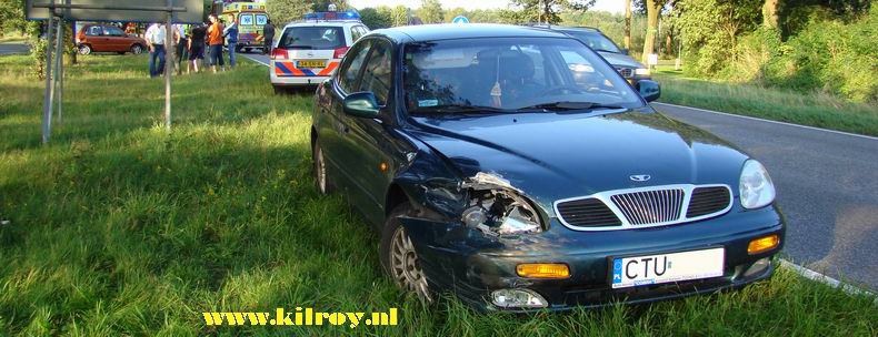 | In het begin van de vrijdagavond vond er op de kruising Ommerkanaal - Oostwijk een forse aanrijding plaats, waarbij drie personenauto's betrokken waren. De bestuurster van een vanmorgen rond 11:00 uur bij een Dedemsvaarts garagebedrijf gekochte spikspinternieuwe Seat Ibiza reed met haar ouders over het Ommerkanaal vanaf Dedemsvaart richting Ommen, toen de bestuurder van een achteropkomende BMW 323 de Seat inhaalde. Tegelijkertijd reed vanaf de Oostwijk een Mercedes met aanhangwagen het Ommerkanaal op zonder de twee auto's voorrang te verlenen. De BMW klapte hard op de Mercedes, waardoor beide voertuigen aan de linker voorzijde zwaar beschadigd raakten. Bovendien kreeg de Seat een tik mee van de BMW, waardoor de Seat de rechter bermsloot in dook en er enkele meters verderop weer uit schoot, waarna het voertuig met flink wat schade op de dam tot stilstand kwam, bovenop een betonnen bermpaal. |
