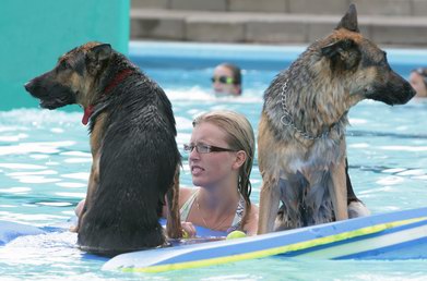 | Ze hadden zeker geen watervrees. Integendeel: de viervoeters stoven het water in en uit. Daar was zeker geen aansporing voor nodig. Met het zwemmen met de honden kwam dus een eind aan het zwemseizoen in het openluchtbad De Waterlelie, dat met meer dan 50.000 bezoekers een bijzonder goed seizoen achter de rug had. |