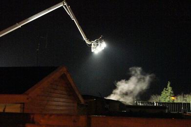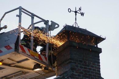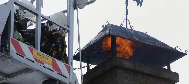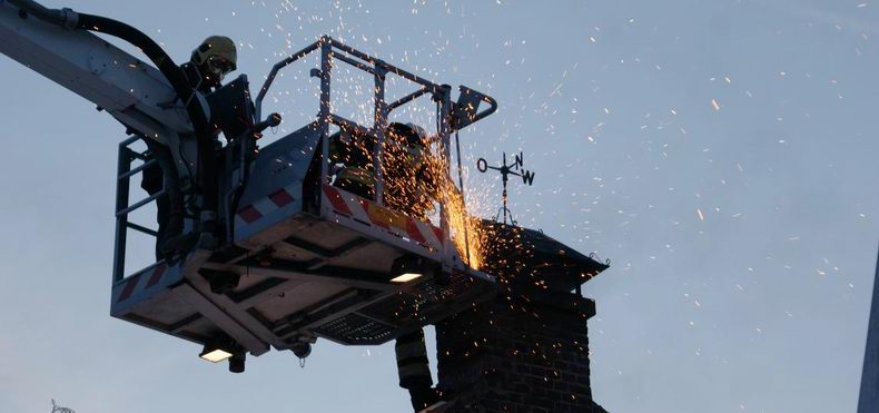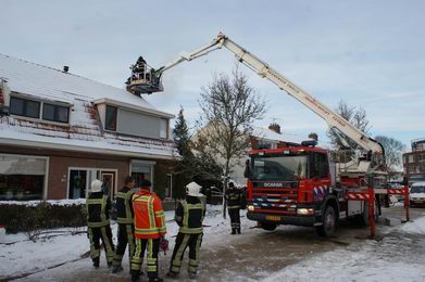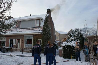 Iets voor half drie sloeg de vrouw des huizes alarm bij de meldkamer. Terwijl de tankautospuit onderweg was, werd ook de hulp van een hoogwerker uit Zwolle gevraagd. Al snel bleek, dat dit geen gemakkelijke klus zou worden: het rookkanaal had namelijk een paar lastige bochten en op ongeveer twee meter vanaf de schoorsteen zat een behoorlijke blokkade, waar men met geen mogelijkheid doorheen kwam. Na vele pogingen werd besloten om een stuk uit de schoorsteen weg te breken om de blokkade weg te halen. Uit metingen bleek, dat de temperatuur in het kanaal inmiddels al flink gedaald was. Toch kwam er steeds rook uit kieren van de schoorsteen. Tegen half zeven keerde de hoogwerker terug naar de post in Zwolle. Ondertussen was er ook iemand van de Stichting Salvage aangekomen om ervoor te zorgen, dat de schade zo snel mogelijk gerepareerd werd. |