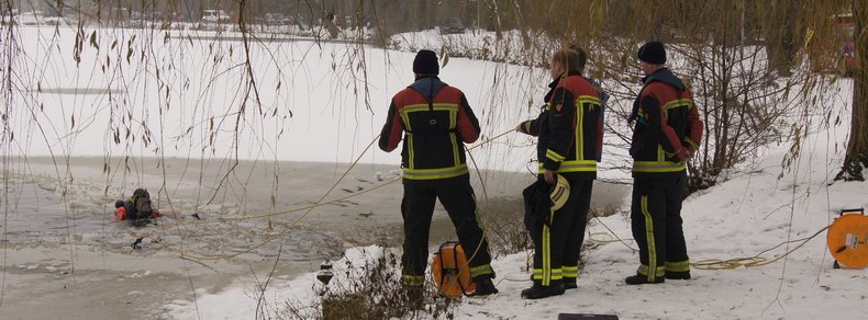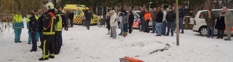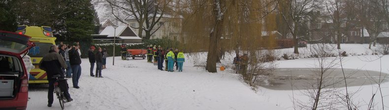 | Een verontruste voorbijganger belde vanmiddag 112, nadat het er op leek, dat er iemand onder het ijs van de vijver in het van Heutzpark terecht was gekomen. Voet- en slee-sporen leidden naar een wak, maar er waren zo te zien geen sporen, die in tegenovergestelde richting liepen. |
