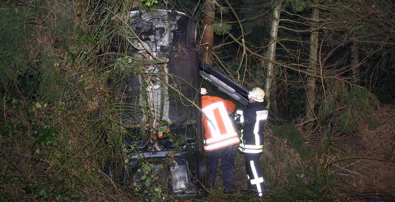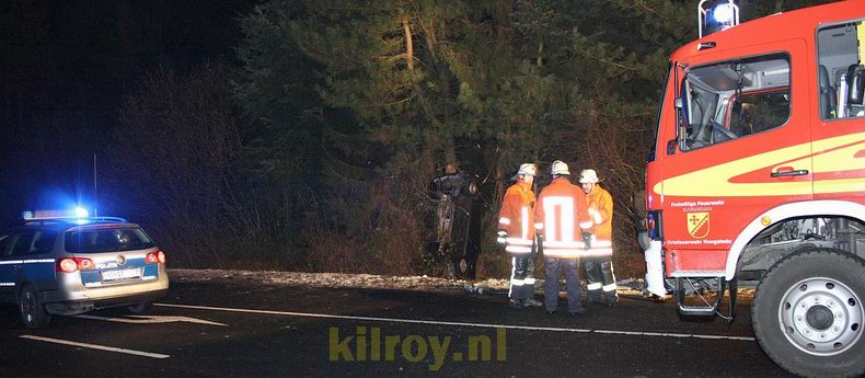 | De brandweer van Hoogstede rukte uit met vijf voertuigen en 35 man. De licht gewonde vrouw kon zonder gebruik van hydraulische apparatuur uit haar benarde situatie bevrijd worden. Ze werd uit voorzorg naar het ziekenhuis in Nordhorn overgebracht. Haar auto was total loss. |