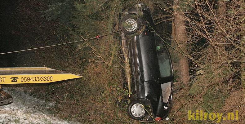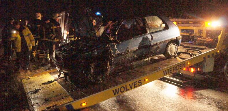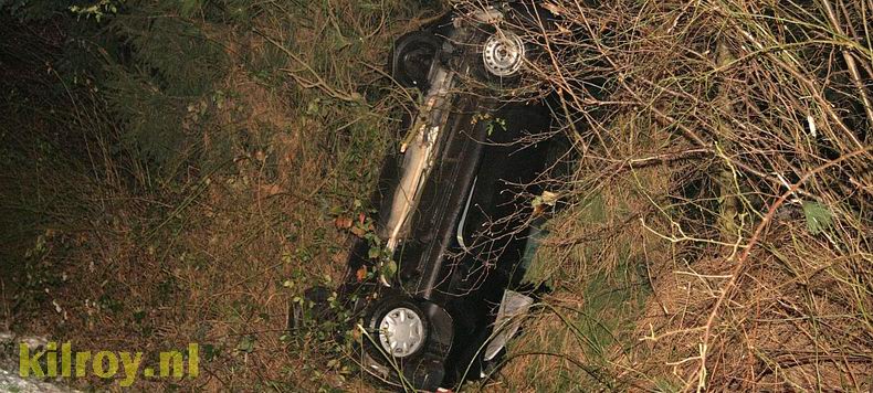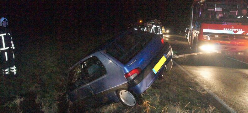 | De spuitgasten vonden een Peugeot 106 personenauto, die door nog onbekende oorzaak met de neus in de bermsloot tot stilstand was gekomen. De twee inzittenden -naar verluidt een man en een vrouw- werden door de brandweer in veiligheid gebracht. De zwaar beschadigde auto, die door de brandweer met de lier werd gezekerd, werd door berger Wolves uit de sloot getakeld en afgevoerd, waarna de weg werd vrijgegeven voor het verkeer. |