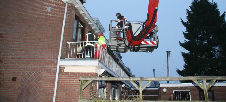 | Daar was een oudere man afgelopen nacht van de trap gevallen en had daarbij schouder- en heupletsel opgelopen. Hij moest via het achterbalkon uit huis worden gehaald. |