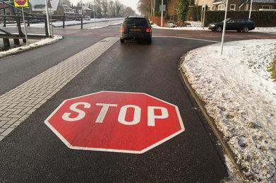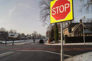 | Overmaatse STOP-borden vóór de kruising en dito op het asfalt geschilderd: je zou zeggen: "Wat kan er nu nog mis gaan?" Maar toch klonk donderdagmiddag opnieuw het geluid van kreukelend blik op de beruchte kruising van de De Magnolia met de Moerheimstraat. |