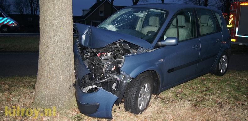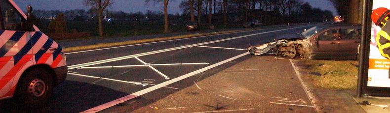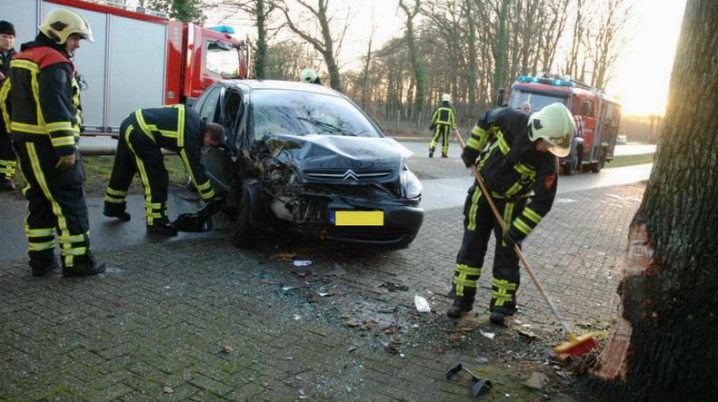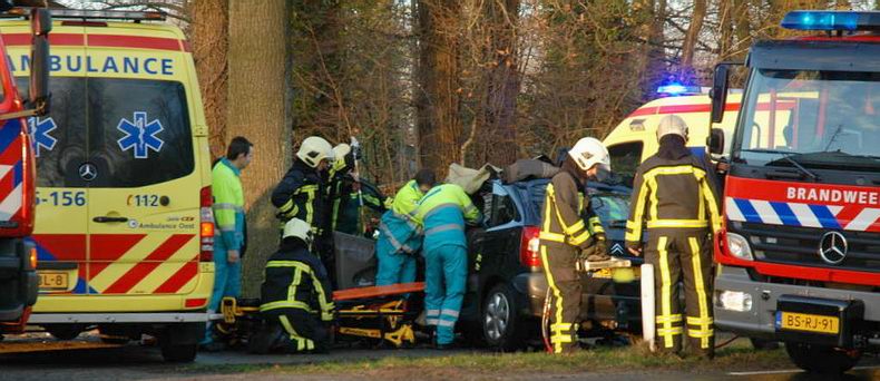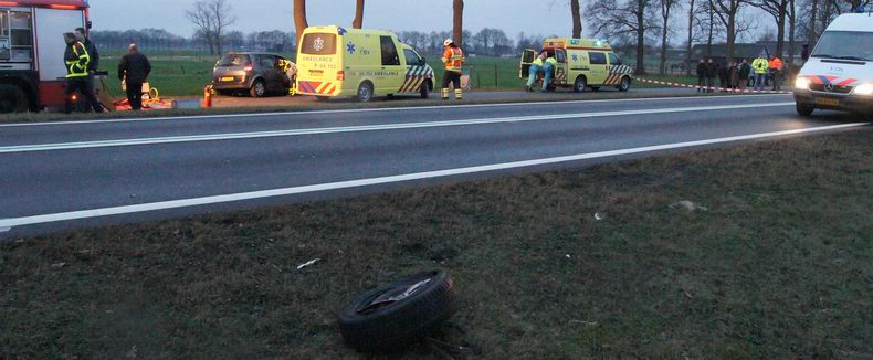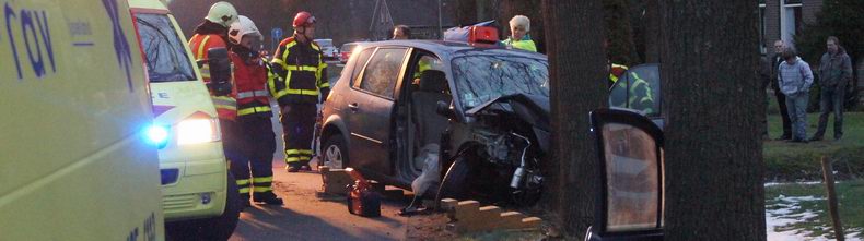 | De man en de vouw in de auto, die tegen de boom was gereden, werden door de brandweer uit het voertuig geholpen. Voor zover bekend liepen in totaal vier personen letsel op. Berger Leerentveld haalde de wrakken op. |