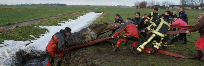 | Met behulp van de kracht van alle brandweerlieden en een paar sterke agenten werd het paard weer op het droge getrokken. Ondertussen stond in de stal alles al klaar om ervoor te zorgen, dat het beest weer op temperatuur kon komen. |
