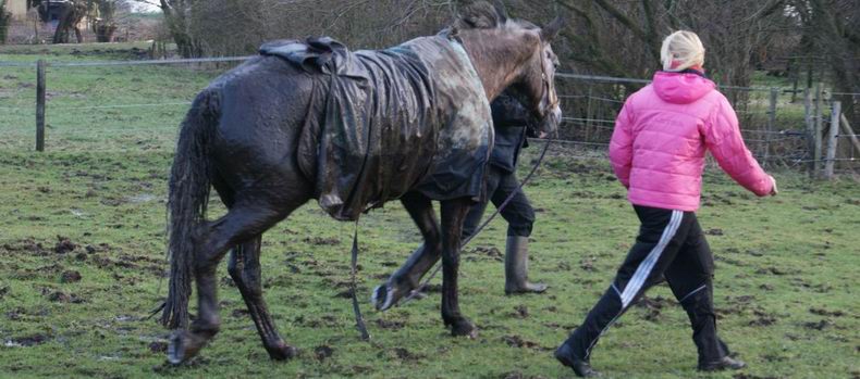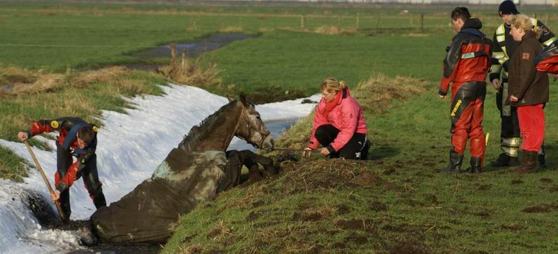 | Zondagmorgen werd de hulp van de Hasselter brandweer ingeroepen: er verkeerde een dier in nood. Zij konden hun handen uit de mouwen steken aan de Driehoek, waar een paard in een sloot lag. Het dier was door het slechte weer enkele dagen niet buiten geweest en was dan ook door het dolle heen, toen het weer door het weiland kon rennen. Iets te enthousiast; zo bleek: het paard kwam met z'n achterste in de sloot terecht en zat muurvast. |