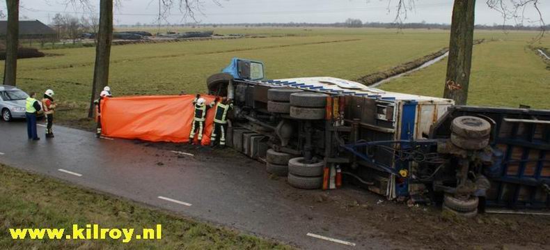 Op de N331 vlakbij Zwartsluis is rond 9.15 uur een vrachtwagen met aanhanger van de dijk geraakt en tegen een boom gekanteld. |