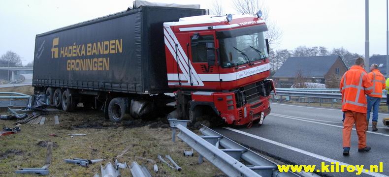 | De vrachtwagen kwam uit de richting Veendam en reed rechtdoor op de plaats, waar de wegen van de N33 zich splitsen, rechtdoor de berm in. De vrachtwagen raakte door het ongeval zwaar beschadigd. De N33 is uren afgesloten geweest. |