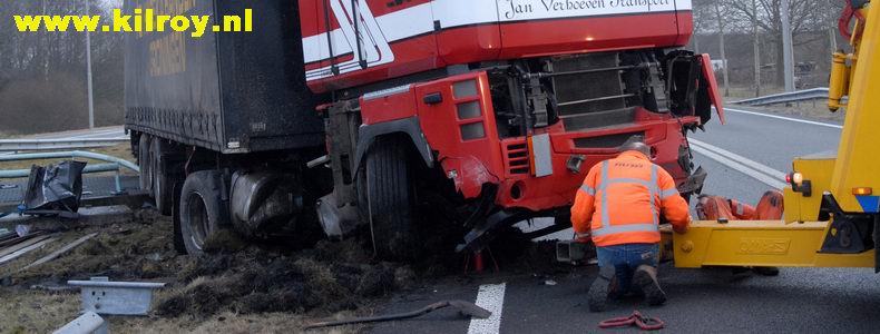 De truck schoot door de vangrail en kwam op de andere rijbaan terecht. De chaufeur raakte hierbij gewond aan z'n been en werd overgebracht naar het ziekenhuis. Onbekend is, hoe het ongeval heeft kunnen ontstaan. |
