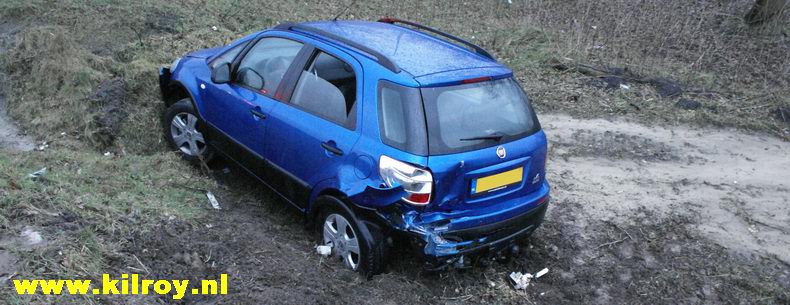 | De auto slipte de natte rechterberm in en kwam na een kwart slag met de neus in de bermsloot tot stilstand. |