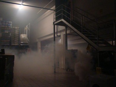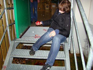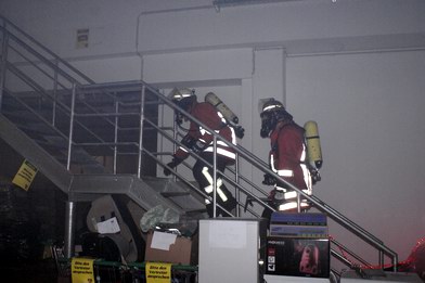 | Keiharde explosies klonken vanavond rond half acht boven het Ringcenter winkelcentrum in Nordhorn. Het was de start van een groots opgezette en goed geheim gehouden multidisciplinaire rampenbestrijdingsoefening, die zich in en rond het winkelcentrum afspeelde en waar o.a. politie, diverse brandweerkorpsen (waaronder die van Denekamp), het Deutsche Rotes Kreuz, de Malteser, het Technisches Hilfswerk, een reddingshondeneenheid en de reddingsbrigade aan deelnamen. We waren er getuige van, hoe voorafgaande aan de oefening een kleine twintig "slachtoffers" realistisch geschminkt werden. Zij vormden korte tijd later de kern van de reddingsoperatie. Het oefenscenario hield in, dat er na een reeks explosies brand was uitgebroken in de verwarmingsruimte van het winkelcentrum en dat de brand zich in en op het gebouw had verspreid. Niet alleen in, maar ook buiten het gebouw en zelfs in de Vecht lagen slachtoffers, die gered en behandeld dienden te worden. Zelfs in het aangrenzende park lag een gewonde, die aan de hand van de geur van een sjaal door reddingshonden opgespoord moest worden. |