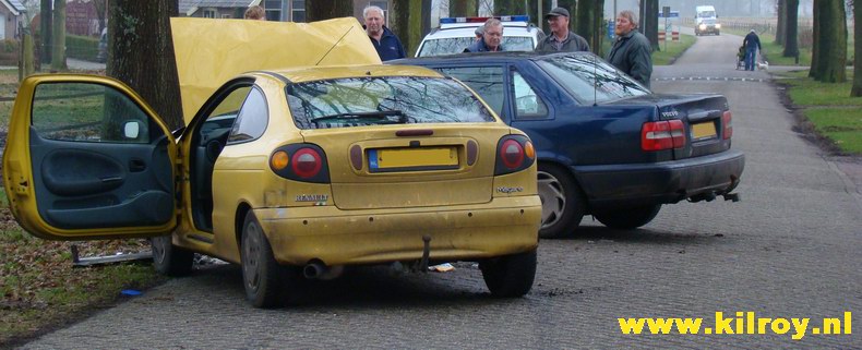 | Er viel één gewonde en twee auto's werden onherstelbaar vanmiddag beschadigd bij een aanrijding op de Esweg in Dwingeloo. De bestuurder van een Volvo S70 sloeg vanaf de Middenlaan linksaf de smalle Esweg op, net toen daar een gele Renault Mégane van links de kruising naderde. De Renaultbestuurder probeerde door uit te wijken en krachtig te remmen een aanrijding te voorkomen, maar dat lukte niet meer. Bij de frontale aanrijding werden beide auto's zwaar beschadigd. De bestuurders kwamen er zonder kleerscheuren vanaf, maar de eega van de Volvobestuurder bezeerde haar knie en werd per ambulance naar een ziekenhuis overgebracht. Brandweerwagens, die via de Esweg onderweg waren naar de grote natuurbrandoefening Pijpestro (zie artikel), moesten omrijden, omdat de weg geblokkeerd was. Berger Leerentveld haalde de twee auto's op. |