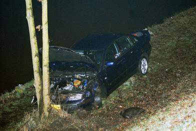 De auto, waarin ze zaten, kwam in de rechterberm terecht, sloeg over de kop en kwam tegen een boom, zo'n vier meter lager langs het kanaal, op de wielen tot stilstand. |
