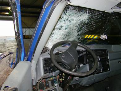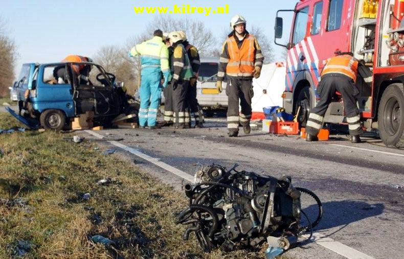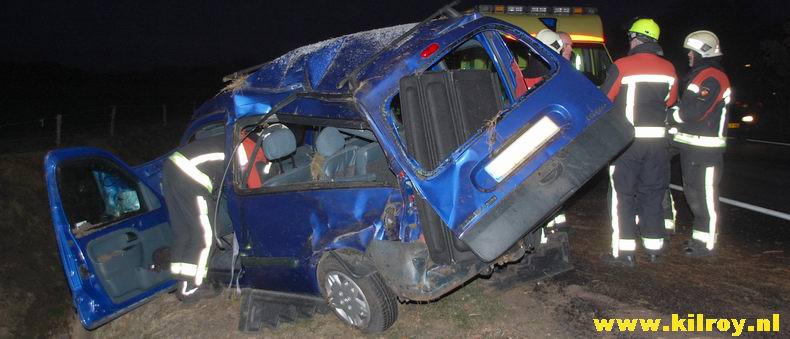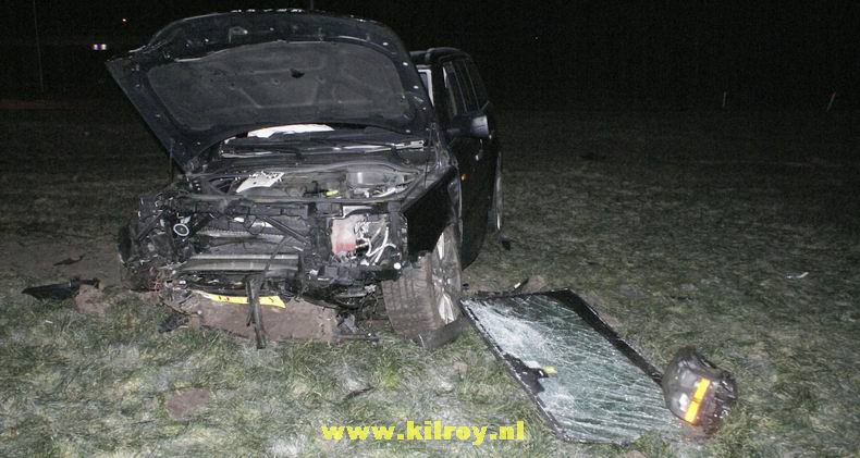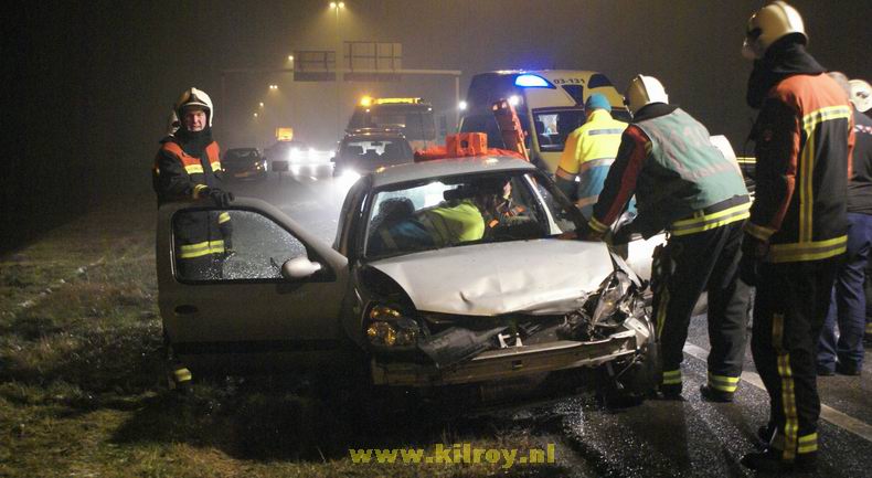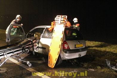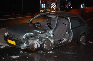 | De auto raakte door de botsing zo zwaar beschadigd, dat hij afgeschreven kan worden. Het ongeval is waarschijnlijk het gevolg van gladheid door ijzel. |