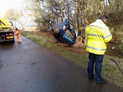 | De bestuurder liep lichte verwondingen aan z'n gezicht op, maar kon zelf uit de onherstelbaar beschadigde auto komen. Met name de buitenwegen in Drenthe waren plaatselijk spiegelglad. |