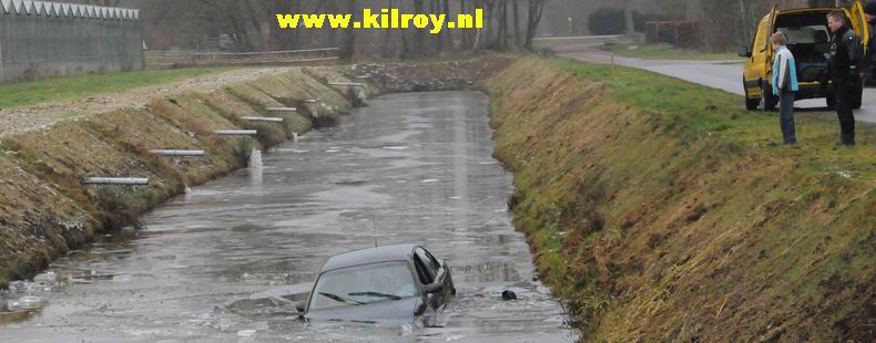 | Een personenauto is vrijdagochtend op het spekgladde wegdek van Het Ambacht in Klazienaveen geslipt en het bevroren water van een afwate-ringssloot in gereden. |