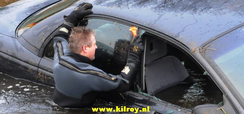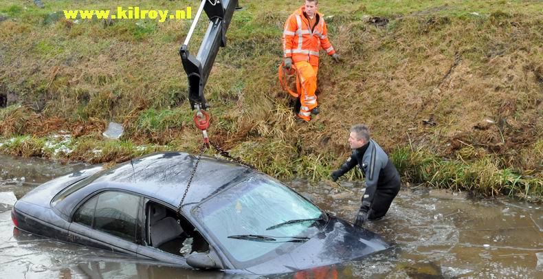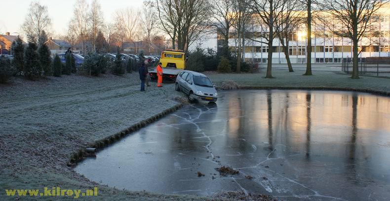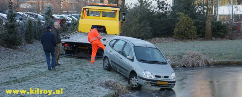 | Helaas was hij vergeten de handrem aan te trekken of de auto in de versnelling te zetten, waardoor de auto langzaam maar zeker achteruit rolde en op het ijs belandde. Gelukkig bleek dat door de vorst van de afgelopen dagen net dik genoeg om het gewicht van de Renault te dragen. De auto liep geen schade op en stond even later weer op de oprit. |
