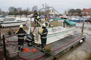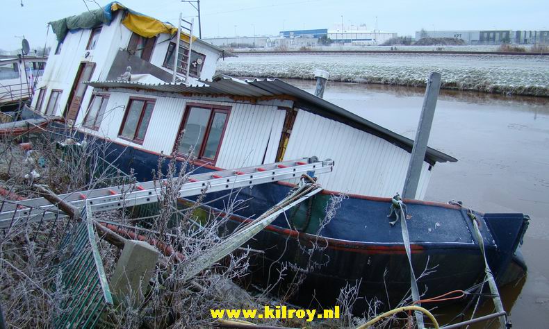 | De bewoner van een aan de Bellweg afgemeerde woonboot keek vanmorgen rond negen uur vreemd op, toen hij na een nachtje stappen thuis kwam: zijn drijvende woning stond vol water en maakte al zo'n veertig graden slagzij ! De Coevorder brandweer werd opgeroepen, maar de inzet van pompen leverde niet het gewenste resultaat op, omdat het water via de wc en langs de ramen net zo hard naar binnen stroomde, als het er uit gepompt werd. Daarop besloot men de slagzij op te heffen door kraanbedrijf Goverts uit Hardenberg te vragen, de woonboot aan één kant op te tillen. |