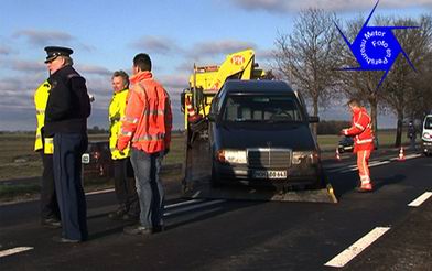 | Ook elders op de N34 ging het verkeerd. Een uit Dedemsvaart afkomstige bestuurder van een gele Renault Megane, die op de N34 ter hoogte van de de afslag naar Emlichheim richting Emmen reed, ontdekte, dat het waarschuwende telefoontje, dat net bij hem binnenkwam, niet ten onrechte was. Ook hij vloog "live" van de weg, maar bleef met twee wielen boven de "afgrond" hangen en werd door voorbijgangers uit zijn auto getrokken. De Dedemsvaarter kwam met de schrik vrij. |