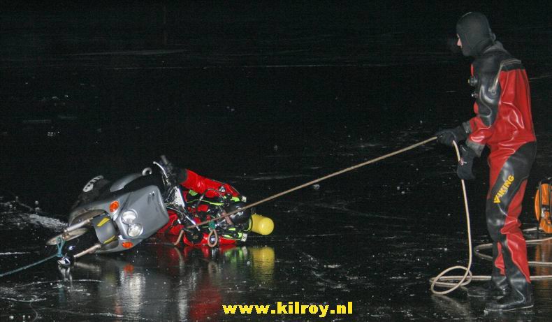 | Hij werd met hulp van omstanders uit het ijskoude water bevrijd. De toegesnelde brandweerduikers visten z'n scooter uit het wak. |