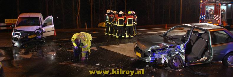 | De vrouw werd hierna zo voorzichtig mogelijk uit haar auto bevrijd, waarbij de brandweer het linker portier wegknipte met hydraulische appara-tuur. In de andere twee auto's vielen geen gewonden, ondanks de zware schade. De omstandigheden van de aanrijding werden geregistreerd door een brigadier van de VOA, waarna de brandweer de rommel op mocht ruimen en berger Kraal zich over de wrakken kon ontfermen. |