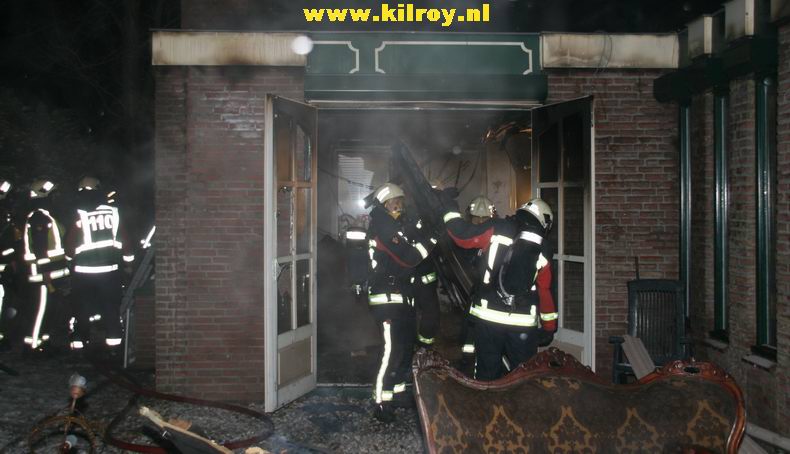 | De woonkamer liep grote schade op: het plafond kwam naar beneden. Omdat de brand tussen het plafond en het dak kroop, was deze moeilijk te bestrijden. De bungalow was voor een groot deel ingericht met kunst en antiek, maar vreemd genoeg waren er geen r Het vuur is vermoedelijk begonnen bij een onlangs aangelegde open haard. |