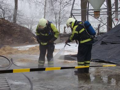 | Het bluswerk werd voor de brandweer -letterlijk- een koud klusje: het sneeuwde flink. |