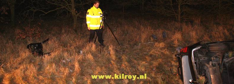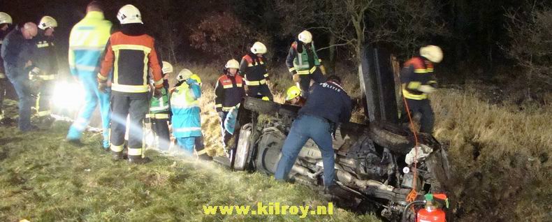 Het voertuig kwam een meter of vijftien verderop op z'n wielen, maar geheel vernield tot stilstand. De Emmer brandwer rukte uit voor assistentie. |