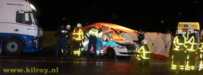 | De bestuurder van de politieauto moest door de brandweer uit het wrak worden bevrijd; de andere politieman kon na behandeling in het ziekenhuis naar huis. De trucker kwam met de schrik vrij. De toedracht van het ongeval werd onderzocht door verkeersongevalsanalisten van het korps Noord- en Oost-Gelderland. De weg is tot circa 08:00 uur afgesloten geweest. |