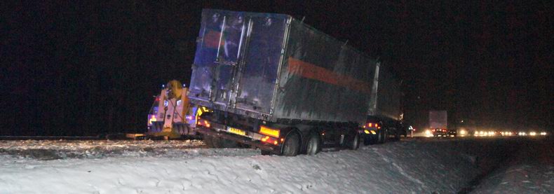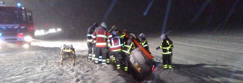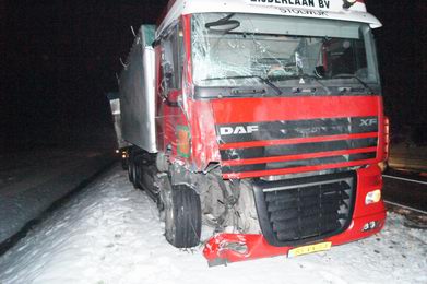 De bestuurder en een passagier zijn voor controle per ambulance overgebracht naar een ziekenhuis. De tankwagenchauffeur zag de auto, die de vrachtwagen passeerde, plotseling op de sneeuwlaag slipte, tolde en tegen het linker voorwiel van de tankwagen botste, waarna de personenauto tegen de vangrail tot stilstand kwam. De tankwagenchauffeur kon enige honderden meters verderop zijn combinatie op de vluchtstook stilzetten. De tankwagen had alleen schade aan het voorwiel en kon na controle z'n weg vervolgen. De chauffeur kwam met de schrik vrij. |