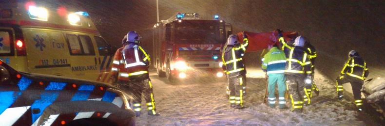 | Nadat er vanmiddag al een waarschuwing voor winters weer werd afgegeven, heeft het KNMI vanavond gewaarschuwd voor extreem weer uit doen gaan: het gaat sneeuwen en dat kan in combinatie met wind (kracht 5 - 7 Bft) leiden tot sneeuwjacht en sneeuwduinen. Het front breidde zich zaterdagmiddag over het gehele land uit. Op diverse plaaatsen vormde zich spekgladde plekken, toen sneeuw uit akkers en weilanden door de wind de weg op werd geblazen en daar bleef liggen. Met name in bochten, zoals op knooppunt Holsloot, leidde dit al tot gevaarlijke situaties. Even verderop - bij Veenoord- gebeurden vandaag door gladheid door stuifsneeuw twee ongevallen; het laatste tegen vier uur vanmiddag. |