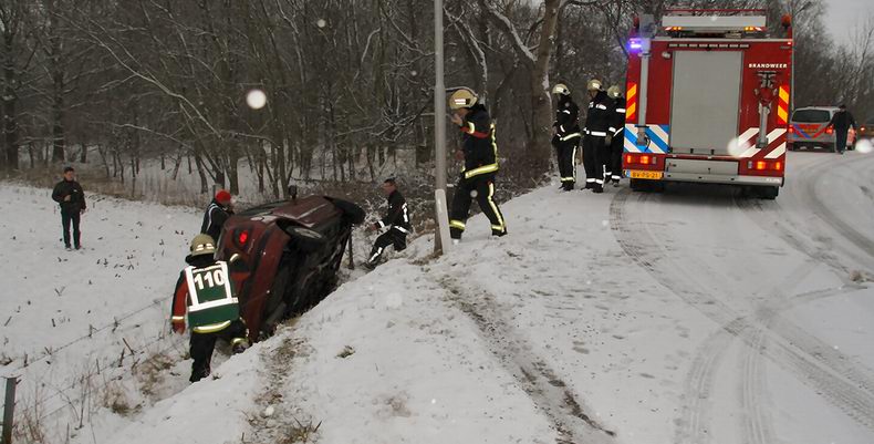 | Op de Wijsterseweg, even buiten Hoogeveen, is een personenauto in de bocht voor de spoorwegovergang rechtdoor gegleden en in de droge sloot geëindigd. Niemand raakte gewond. Door nieuwe sneeuwval was het wegdek spekglad geworden en de snelheid bleek iets te hoog. Remmen had geen zin meer. De auto raakte tijdens de glijpartij nog net een lantaarnpaal, die enigszins uit het lood kwam te staan. De wagen kantelde op de bestuurderszijde in de droge sloot, waardoor de bestuurster er niet zo maar uit kon. Aangezien de vrouw niet gewond was, heeft de brandweer de auto met de vrouw er nog in, zodanig de kant op getrokken, dat zij door brandweer-mannen uit haar benarde positie kon worden bevrijd. Eenmaal op de kant kon ze haar verhaal kwijt. |