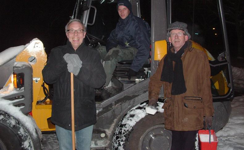 | Een eerste bluspoging met een brandblusser haalde niet veel uit, maar de brandweer was er zeer snel bij en wist de vlammen in het motorcompartiment in zeer korte tijd te doven, waarbij ook schuim werd ingezet. Daarna werd een poging gedaan, de vernielde graafmachine, waarvan de hydrauliek was uitgevallen en de wielen geblokkeerd waren, uit de schuur te slepen, maar dat viel -mede door de sneeuw- nogal tegen. Uiteindelijk waren er maar liefs drie zware tractoren voor nodig om de Ahlmann naar buiten te krijgen. De toeschouwers kregen dus een nieuwe vorm van Trekker-Trek te zien.... |