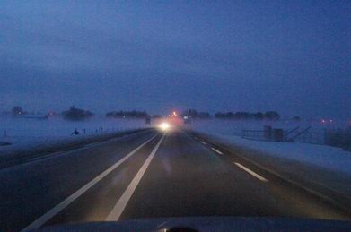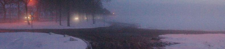 | Overdag (foto 1) waren er op het platteland al wat mistbanken te zien, maar in het begin van de avond breidden die zich in rap tempo uit en vormden zich plaatselijk verraderlijk dichte muren van mist, waarbij het zicht terugliep tot minder dan vijftig meter. |